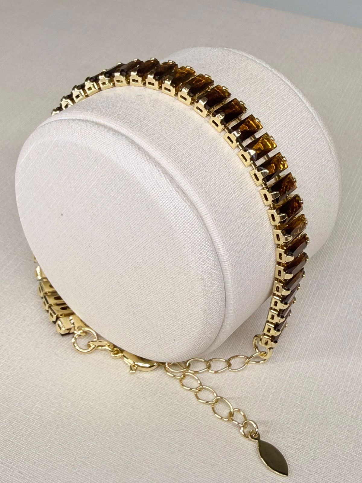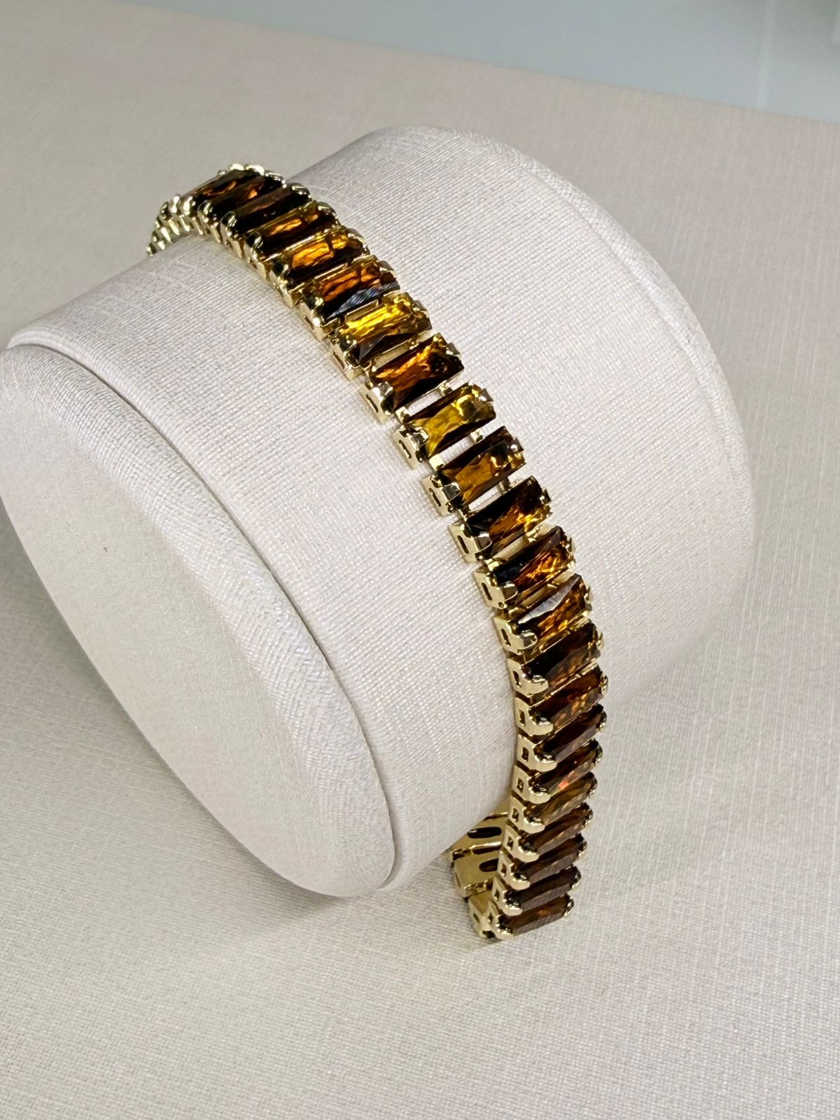 Uma pulseira baguete marrom é o equilíbrio perfeito entre sofisticação e estilo contemporâneo. Com pedras lapidadas no formato baguete em tons quentes de marrom, ela transmite elegância discreta e versatilidade, combinando facilmente com looks do dia a dia ou produções mais refinadas. Seu design linear e moderno valoriza o pulso com um brilho sutil, ideal para quem busca um acessório atemporal com um toque de personalidade.
