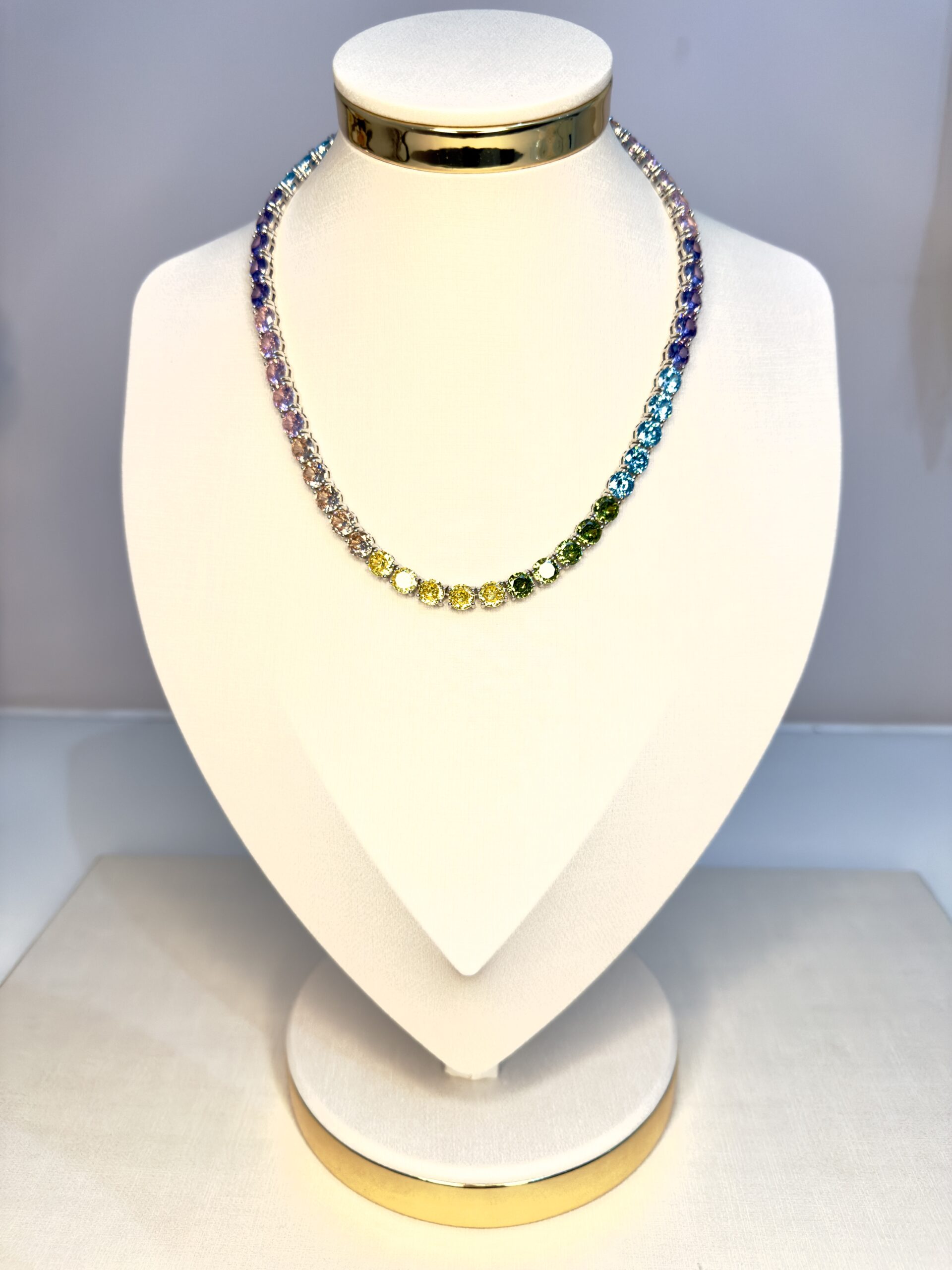 O Colar Riviera Colorido é uma peça sofisticada e vibrante, cravejada com zircônias 7A no elegante modelo cushion. Cada pedra multicolorida é lapidada com precisão para garantir brilho intenso, alto padrão de qualidade e acabamento impecável.